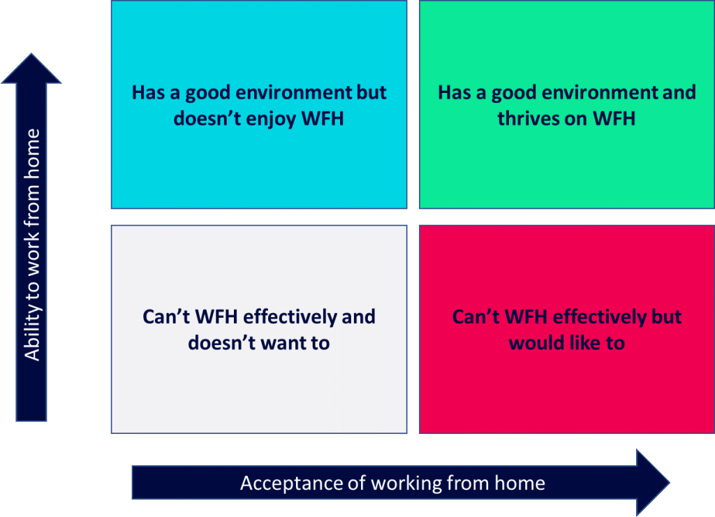 Low ability – This person has a poor working environment at home. They might not have anywhere quiet and comfortable to work. Wifi could be poor. They’ll have distractions from children, pets, housemates. Their work might rely on access to people and information that is not readily available online.